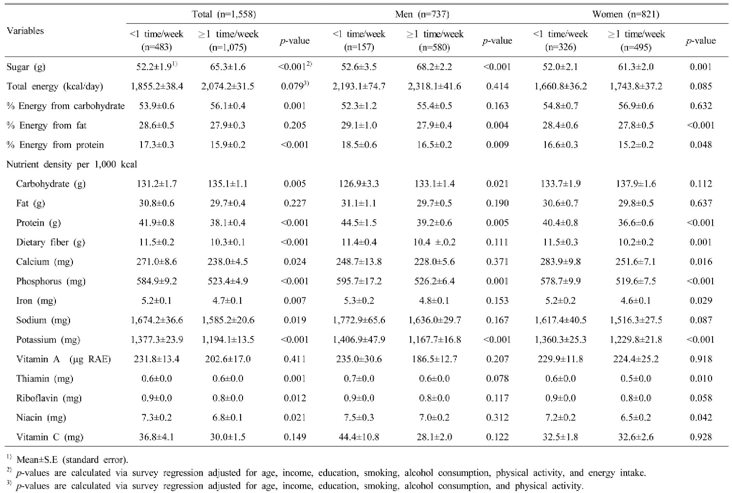 3. 영양소 섭취수준을 비교한 결과, 남녀 모두 탄산음료 주 1회 이상 섭취군은 단백질, 인, 칼륨 섭취는 주 1회 미만 섭취군에 비해 낮았고(p<0.01), 남성의 경우 탄수화물의 섭취가 높았다(p<0.05). 여성의 경우 탄산음료 주 1회 이상 섭취군은 식이섬유, 칼슘, 철, 티아민, 니아신의 섭취가 주 1회 미만 섭취군에 비해 낮았다(p<0.05). 또한 남녀 모두 탄산음료 주 1회 이상 섭취군은 지방의 에너지 기여비율(p<0.01), 단백질의 에너지 기여비율(p<0.05)이 주 1회 미만섭취군에 비해 낮은 것으로 나타났다.