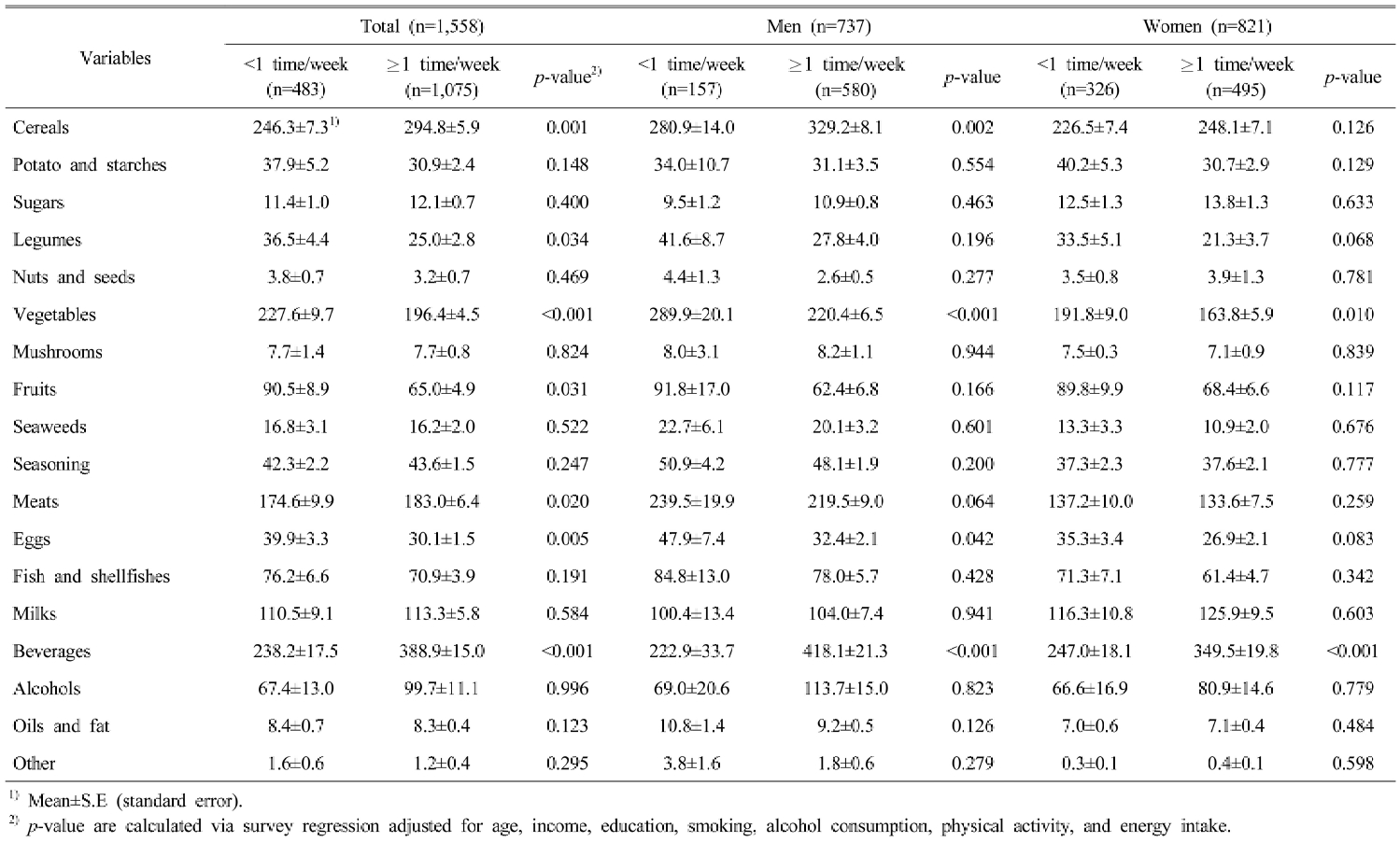 본 연구는 2019∼2021년 제8기 국민건강영양조사 자료를 이용하여 수행되었다(질병관리본부 연구윤리심의위원회 승인번호: 2018-01-03-C-A, 2018-01-03-2C-A, 2018-01-03-5C-A). 조사에 참여한 19∼29세 이하 성인 총 2,376명 중 일일 총 에너지 섭취량이 500 kcal 미만이거나 5,000 kcal 초과인 경우(n=550), 8시간 공복을 지키지 않은 경우(n=201), 분석에 필요한 변수에 대해 결측값을 가지고 있는 경우(n=67)를 제외한 1,558명(남성 737명, 여성 821명)을 최종 연구대상자로 하였다.