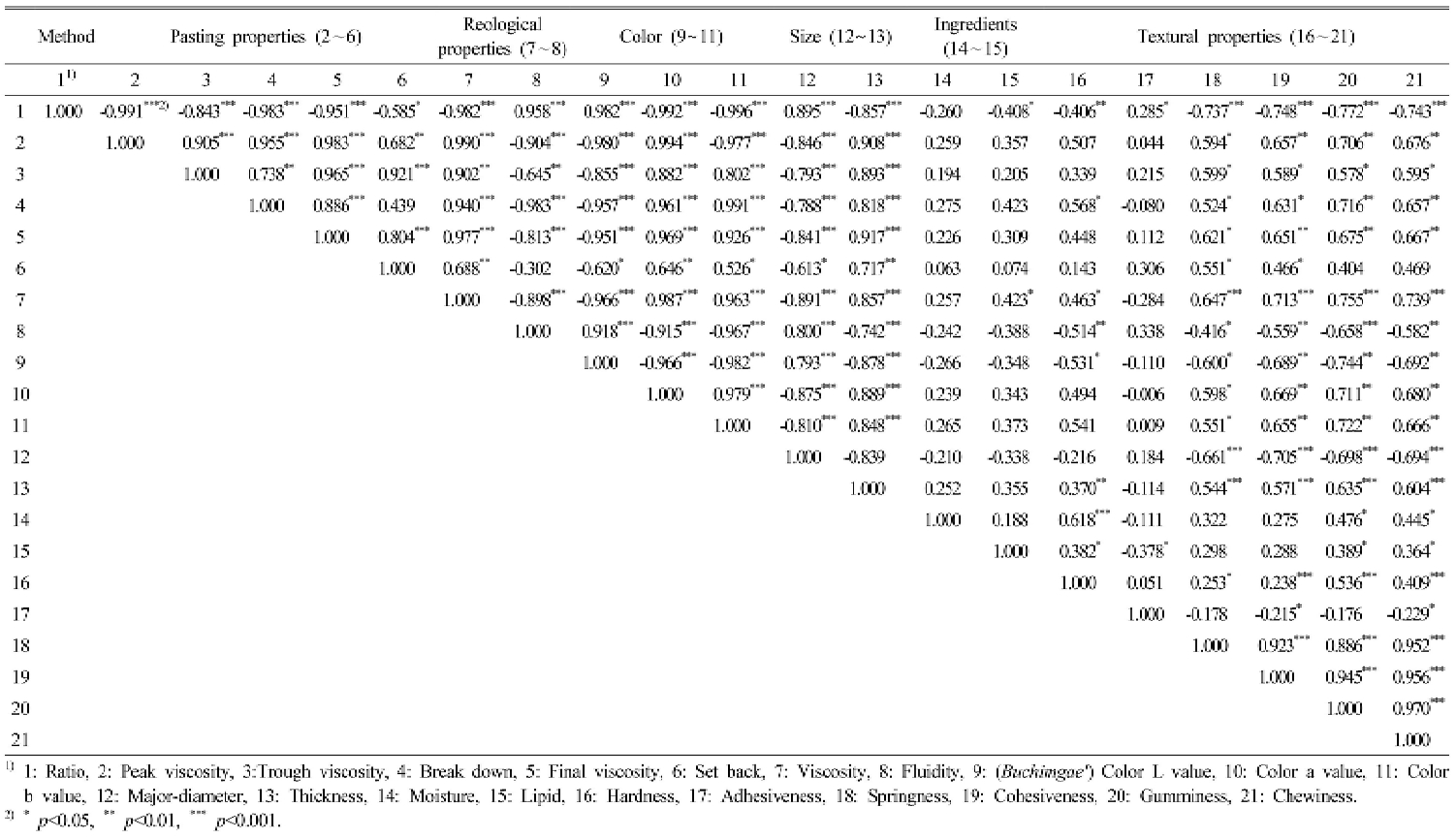 Correlation coefficients between the characteristics of Buchimgae (Korean pancake) premixes according to the mixing ratio of rice flour and wheat flour